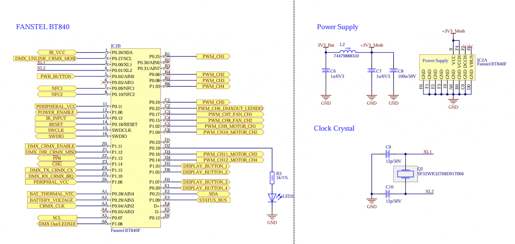 The following circuit shows a example implementation for the Fanstel BT840 Module. Each pin and its functionality is described in the table below.