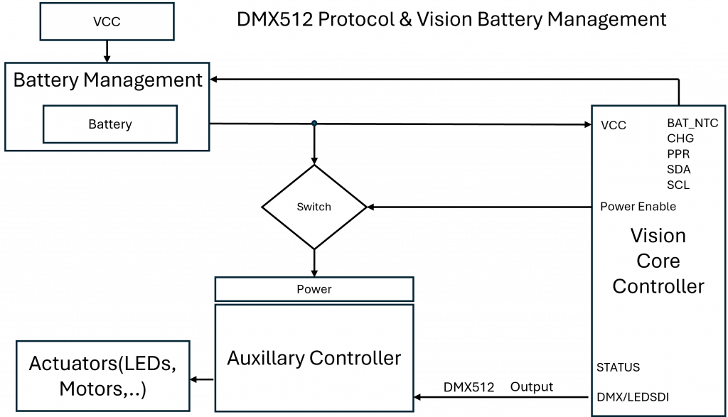 Example 2: Uses DMX512 Protocol an auxiliary controller and the Vision Battery management