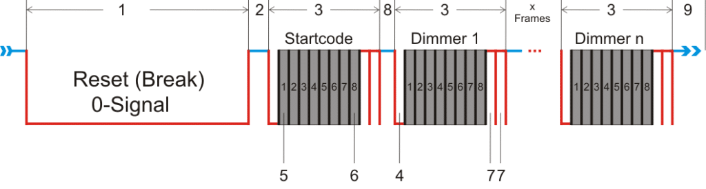 The start of a packet is signified by a break followed by a „mark“ (a logical one), known as the „Mark After Break“ (MAB). The break, which signals the end of one packet and the start of another, causes receivers to start reception and also serves as a frame (position reference) for data bytes within the packet. Framed data bytes are known as slots. Following the break, up to 513 slots are sent.