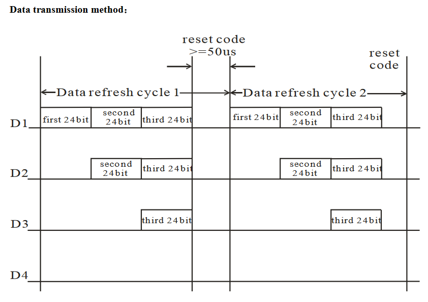 At the end of a sequence of LED data transmissions, a reset pulse is sent to tell the LEDs to update their displayed color based on the data they received. This reset pulse is a low signal that must last at least 50 microseconds.